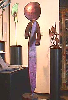 This ominous dancing beast has a plow blade body, tubes for legs, and a motorcycle fender head. Marilyn's studio is cluttered with bits and pieces of metal, old tools, auto parts, and other metal objects she has collected to incorporate into her art. Most of her work is not so obviously created from found objects, nevertheless she takes full advantage of the original forms of the objects she collects to enhance the emotive, figurative, and symbolic qualities of her work.